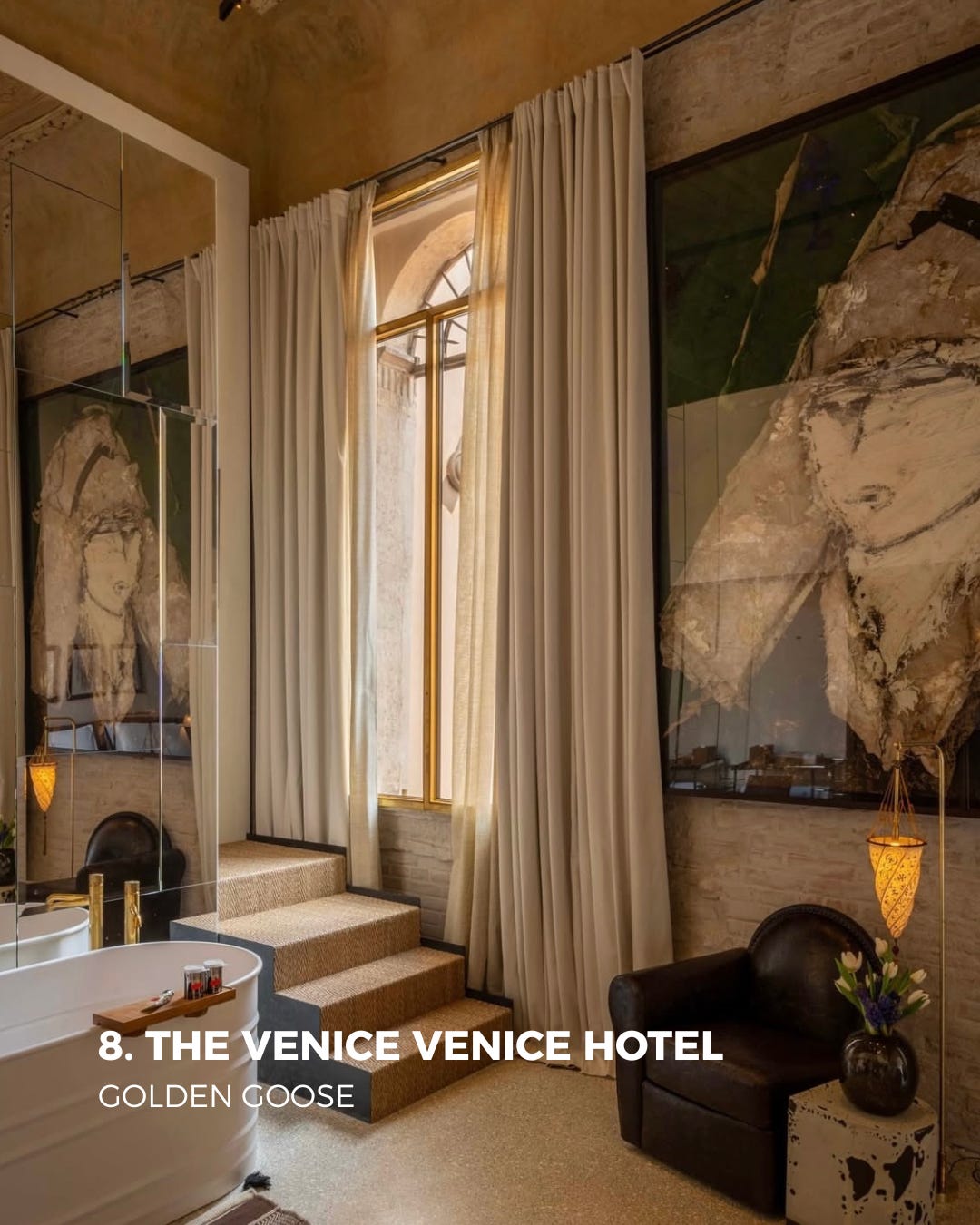 Alessandro Gallo and Francesca Rinaldo, the Venetian couple who founded Golden Goose, turned their creative energy toward the city. The Venice Venice Hotel is one of several bold moves that show just how far their creative vision extends beyond fashion. The hotel occupies Palazzo Ca’ da Mosto, widely considered the oldest on the Grand Canal, a Byzantine structure dating to the 13th century that had spent decades in abandonment before their restoration.
