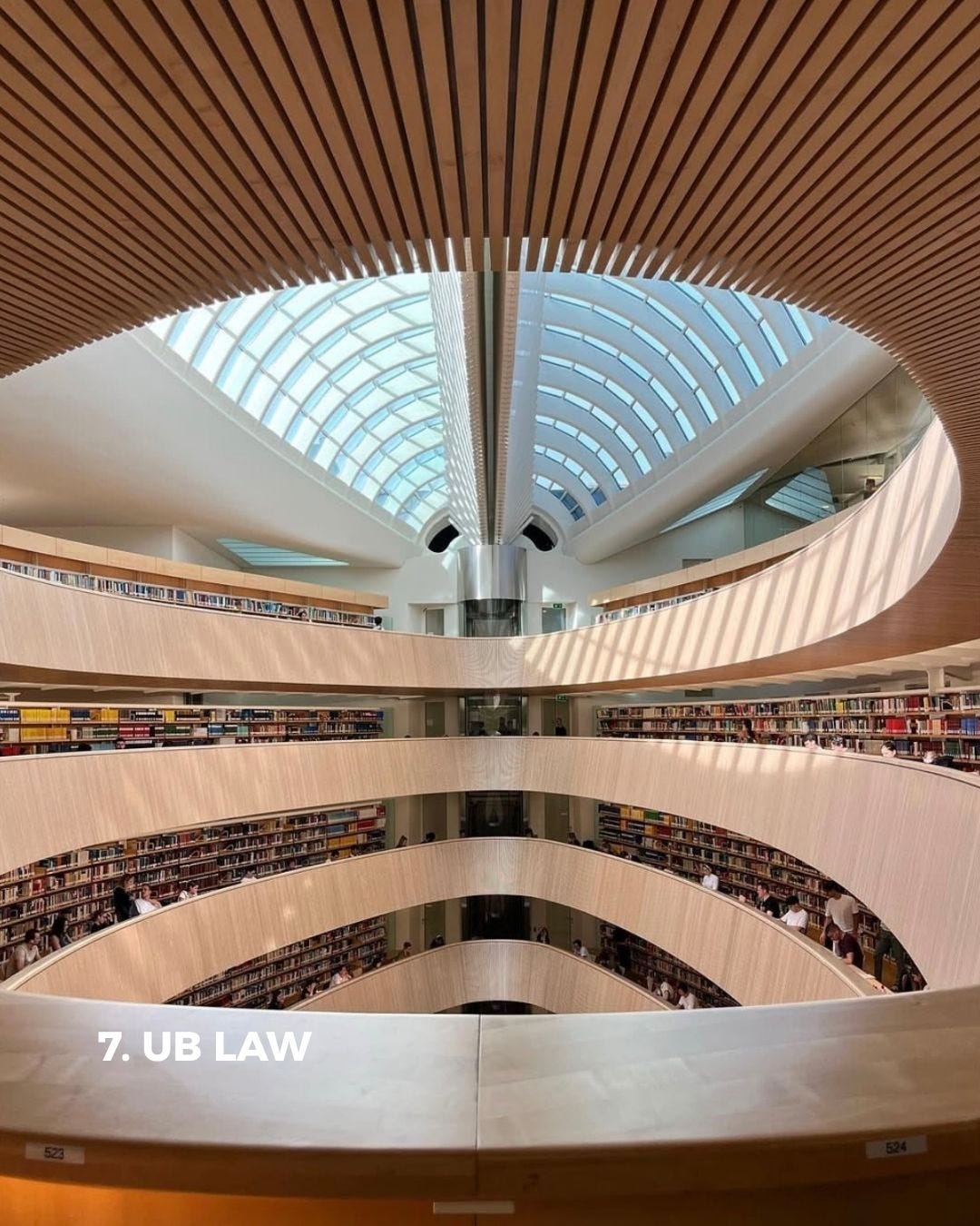 An unexpected library stop in the Faculty of Law. Its elliptical wooden skeleton spirals 30 metres up to a radiant glass dome that floods the entire atrium with natural light. The quietly breathtaking interior is one of the best architectural surprises in the city.